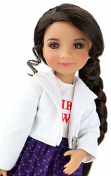 У куклы длинные темно-каштановые волосы, заплетенные в длинную косу, красивые глубокие глаза с огненным центром. На ней фирменная футболка Girl Power