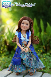 Наряд Дафны вдохновлен американской культурой хиппи и содержит элементы индийской моды и узоров. На ней темно-синий длинный вязаный кардиган поверх светло-голубого топа с оборками, завязывающегося спереди. Юбка из легкого шифона с динамичным принтом пейсли. Оборки на юбке и топе имитируют плеск волн о песок.