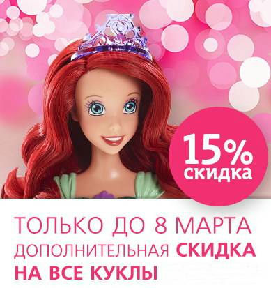 Мы хотели бы, чтобы каждая маленькая умница получила к празднику 8 марта желанную куколку или обновки для своей любимой игрушки. Поэтому для Вас всю неделю дополнительная скидка 15% на всех кукол в нашем ассортименте.