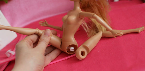 При попытке посадить куклу на шпагат при отведении ноги назад нога неожиданно слетела с шарнира. К счастью, ничего не сломалось, просто одеваем ногу обратно на шарнир: