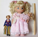 Кукла Precious Moments (30 см) и малышка (10 см), на фото рядом с 18-см куклой. Малышка закреплена в руке большой куклы резинкой.
