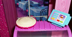 Модное современное кафе, в котором можно позавтракать с подругами или устроить романтический ужин с Кеном. Под красочной розовой аркой с яркой вывеской находится изящный круглый белый столик с ажурной ножкой и два стульчика с узорными спинками.