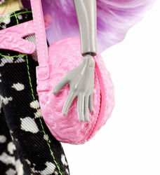 Кукла получила очень выразительное лицо с игриво и хитро изогнутой правой бровью, длинные и густые лиловые волосы с кислотно-зелёной прядкой и стильный современный наряд в зомби-теме.
