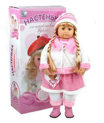 знает более 100 фраз на русском языке. Шевелит губами, плачет и смеется. Кукла воспринимает живую речь, с легкостью отвечает на поставленные вопросы (24 вопроса и фразы на которые реагирует Настенька), рассказывает стишки, загадки, считалки, сказку "Теремок". Обучает счету, в т.ч. с описанием каждой цифры, поможет сделать зарядку, расскажет про времена года. Кукла отвечает на Ваши вопросы (список прилагается), на каждый вопрос несколько вариантов ответов. Настенька отреагирует, если ее перевернуть вниз головой.