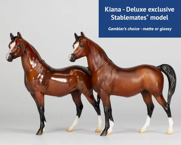 В дополнение ко всем замечательным преимуществам стандартного членства в клубе коллекционеров, у клуба коллекционеров Делюкс есть дополнительная привилегия: в комплект членства входит эксклюзивная модель Stablemates, Kiana! Эта прекрасная пятнистая гнедая арабская кобыла изготовлена на основе одной из новейших скульптур, добавленных в линейку Stablemates, и будет доступна в матовом или глянцевом исполнении, которые будут поставляться случайным образом. Киана будет упакована в красивую атласную сумочку на шнурке с эксклюзивной эмалевой булавкой класса люкс Collector Club, на которой будет изображен ее профиль.