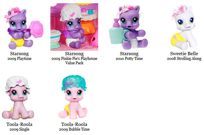 Начиная с поколения 1, Hasbro иногда использует то же имя пони в новом поколении, при этом новая пони не связана с предыдущим пони с тем же именем. Видимо, это происходит из-за лени или забывчивости. (Не путать с детскими версиями взрослых пони, сделанными в G1 и G2.) Некоторые преобразования ранних пони можно найти в G3 в G4. Это может сбивать с толку людей, не особенно осведомлённых о предыдущих поколениях. Идентифицировать фигурки можно по расцветкам и позам.