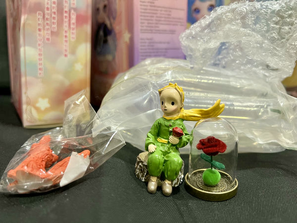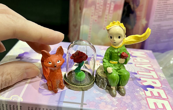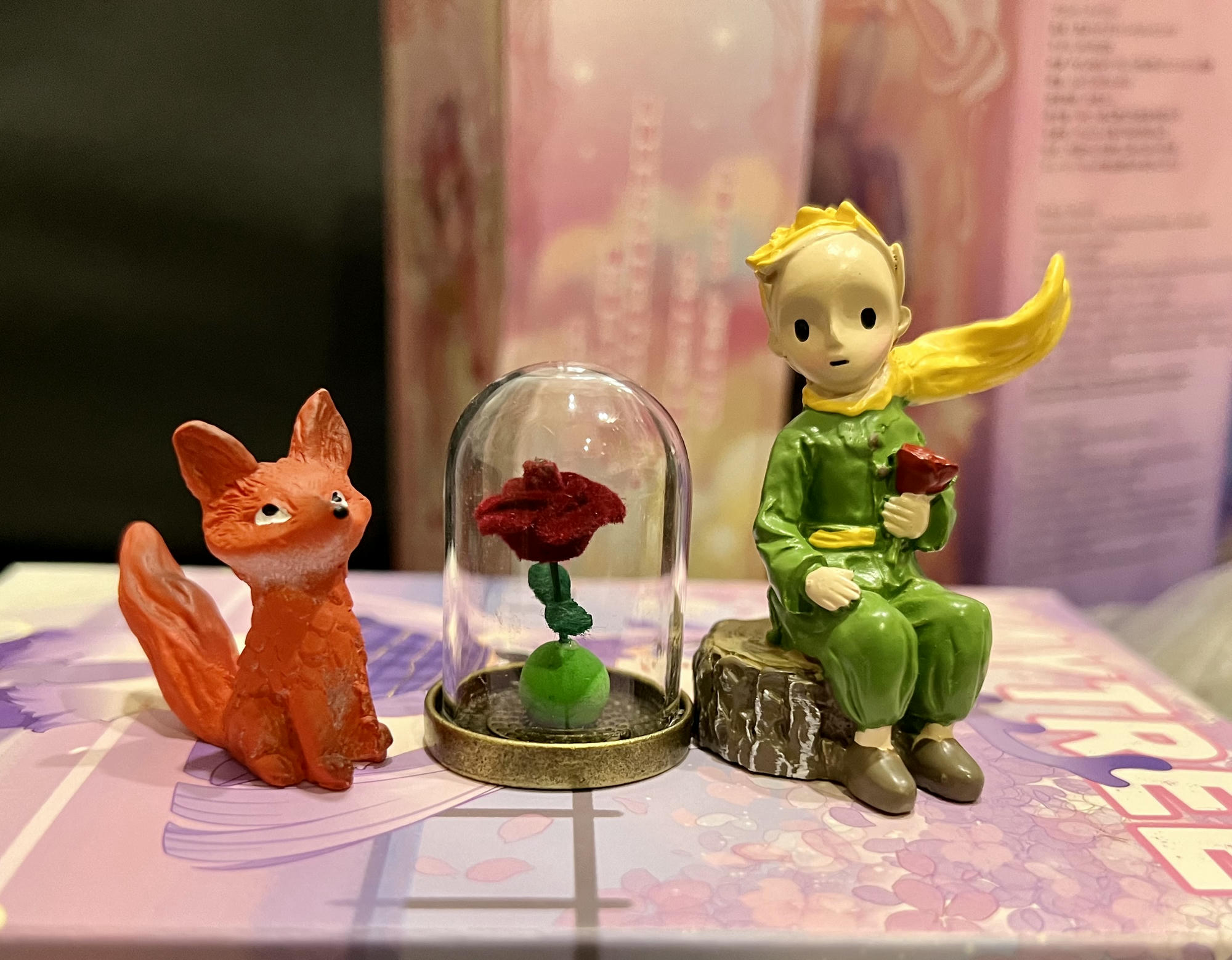 Этот небольшой набор фигурок - из Китая (заказывали через наш маркетплейс, 2025). Можно сказать, случайная покупка. В набор входит сразу три фигурки - сам Маленький принц, рыжий лис и красная роза под куполом.
