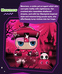 Мьюмью, благородная, но высокомерная ведьма, искажает реальность кошмарами. Ее потрескавшаяся кожа напоминает разбитые мечты, а ее стиль в стиле Блэкпинк и завораживающие фиолетовые глаза без усилий заманивают жертв в свои ловушки.