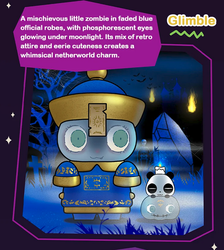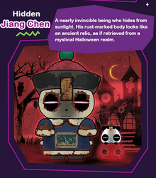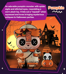 Очаровательный тыквенный монстр с символами паука и вышитыми глазами, напоминающий потрепанную плюшевую игрушку. Он издает "писк", когда его сжимают, и любит приносить таинственные предметы старины на вечеринки в честь Хэллоуина.