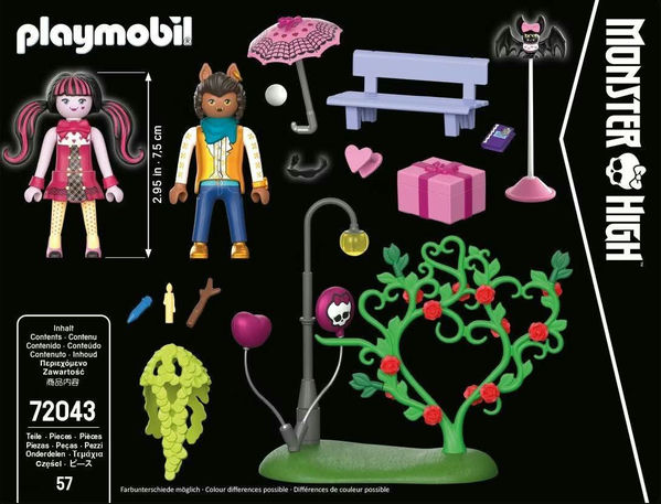 В этом наборе представлены фигурки Дракулауры и Клода Вульфа Playmobil в специальной обстановке ко Дню Святого Валентина, а также тематические аксессуары - стол, напитки и декоративные элементы, которые помогут создать неповторимое впечатление от свидания. Отпразднуйте День Святого Валентина с героями Школы Монстров в невероятно романтичной атмосфере! 57 деталей.