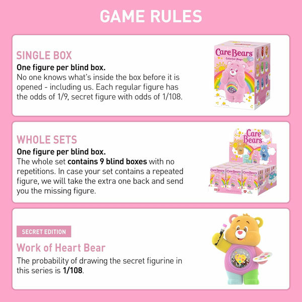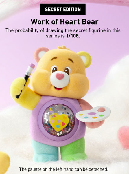В линейку входят девять знакомых персонажей: Cheer Bear, Always There Bear, Friend Bear, Funshine Bear, Good Luck Bear, Wish Bear, Bedtime Bear, Grumpy Bear и Share Bear. Редкий - Work of Heart Bear.