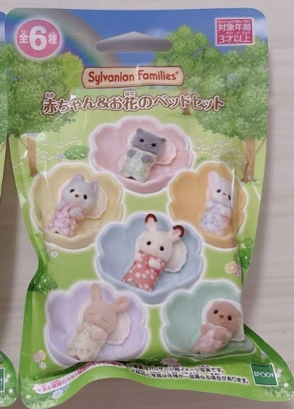 Пакетики-сюрпризы для лотереи, которая проводится в официальных магазинах Sylvanian Families, 2025. У всех фигурок в таких сериях-лотереях одни и те же аксессуары, которые отличаются только цветом. В этой серии у малышей - кроватки в виде листочков (цветочков).