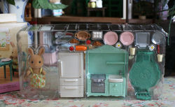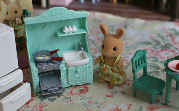 Этот набор - наш маленький праздник (сбылась мечта!), потому что здесь очень красивый цвет мебели, имеется большой холодильник, а еще набор идет с фигуркой из семейства Солнечных кроликов (дочка Джессика). Эти кролики нам очень нравятся за теплый медовый цвет (и они не такие маркие, как светлые фигурки). Так что причин его хотеть было несколько.