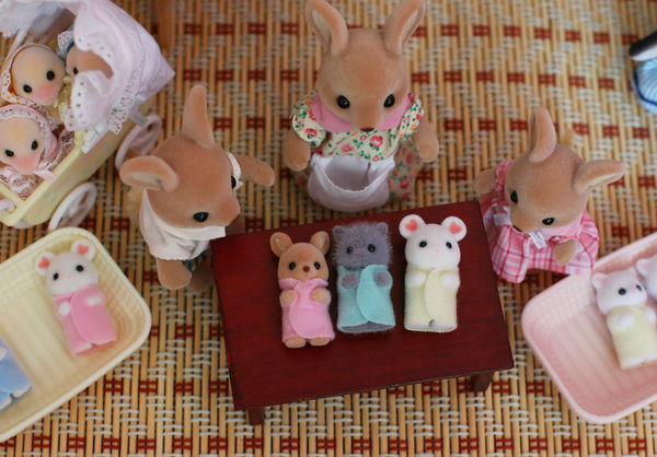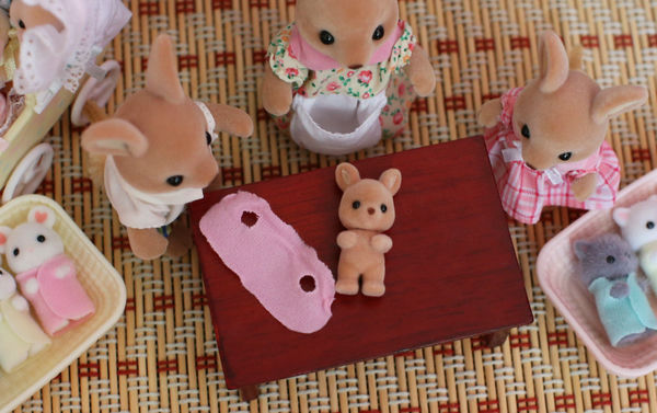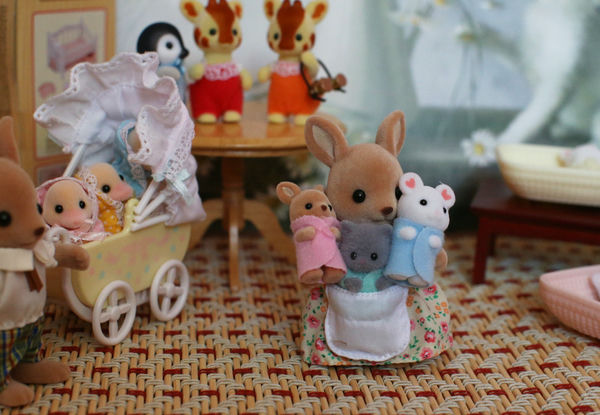 Семья кенгуру у Sylvanian Families в первую очередь привлекает благодаря наличию крошечного малыша в сумке на платьице у мамы. Как и все в мире Сильваниан, это невероятно мило, но с таким малышом в сумке это почти единственное семейство, поэтому оно в некотором роде уникально (еще в семье выдр есть два малыша в кармашках-переносках, но они именно в отдельных переносках, а тут кармашек пришит к маминому платью).