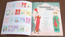 Плотная бумага с панорамами и моделями для наклеивания костюмов, в центре — много страниц с наклейками.