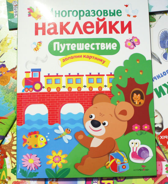 Путешествие. Многоразовые наклейки (Стрекоза, 2016).Книжка с многоразовыми наклейками, которая подойдёт даже для самых маленьких. Картинки яркие, понятные, наклейки - качественные, действительно многоразовые. Играем, переклеивая их так, как нам нравится.