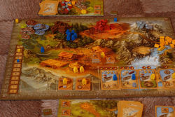 Я играл за Римлян, а сестрёнка (мы играли вдвоём) - за Китайцев. Мы решили разложить большое игровое поле - на четверых, однако по правилам поле должно быть в два раза меньше как минимум. В этом была наша первая чудовищная ошибка, которая помогла мне выиграть - Римляне продвигаются по треку культуры за каждую захваченную хижину или же деревню. Больше карта - больше данных объектов. Поэтому я, практически не затрачивая ни культуры, ни торговли, продвинулся по треку аж до конца второго уровня. Сестра же в поту добывала свою культуру (у неё это хорошо получалось) и сама сумела продвинуться дальше меня.