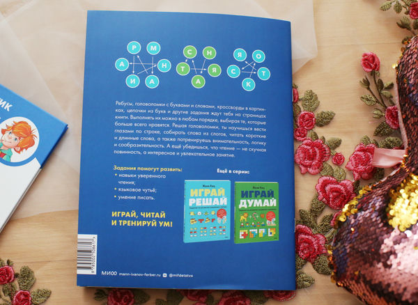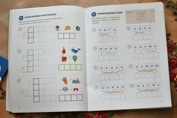 В этой тетради собраны задания на стыке логики, математики и чтения: интересные и нестандартные ребусы, головоломки с буквами и словами, кроссворды в картинках, цепочки из букв, в которых нужно отыскать слова, и другое. В некоторых заданиях слова собираются из букв разного размера, прячутся в табличках, буквы перепрыгивают с места на место. Все вместе это помогает детям начать относиться к чтению гораздо легче, учит получать радость от игры