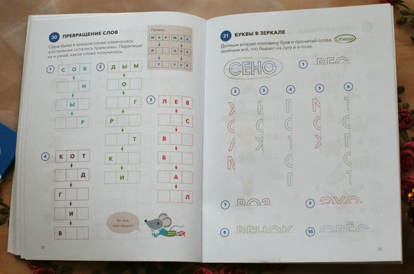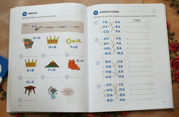 Помимо узнавания букв и развития навыков чтения, эта рабочая тетрадь прекрасно развивает и логику, потому что над некоторыми заданиями придется подумать.