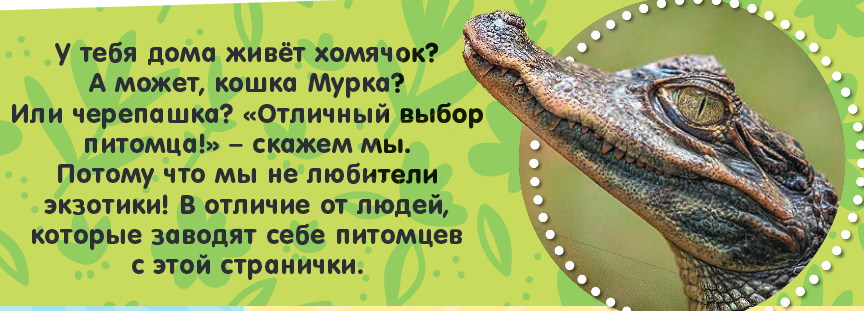 Ну что тут скажешь... Нам жаль бедолаг, которые решили завести крокодила. Только представь: в квартире всегда должна быть жарища (30 градусов!), питомцу нужна отдельная комната с большущим тазом (а лучше бассейн!) и целая гора мяса каждый день. А ещё, как только крокодильчик вырастет, приближаться к нему без палки и защиты уже не получится!
