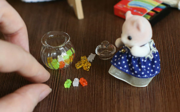 Набор баночек с припасами, удивительно реалистично! Можно рассмотреть кусочки лимона, клубники! А также стеклянная банка с мармеладными мишками.