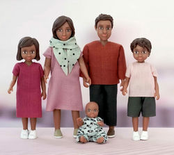 В ассортименте есть несколько наборов кукол - семьи разных национальностей. Пять кукол в каждом наборе: двое взрослых и трое детей, один из которых - маленький ребенок. Также есть семьи с другим количеством кукол, куклы по отдельности и разные питомцы.