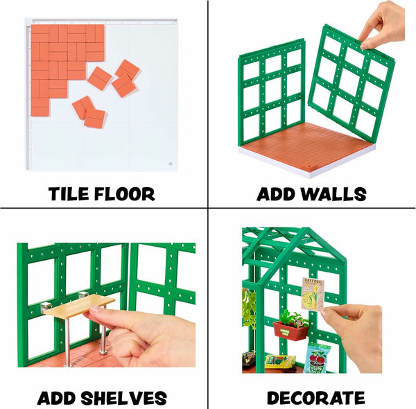 В комплект каждой теплицы входит все необходимое для обустройства пространства - две стеновые панели, облицовка пола плиткой, кровля, мини-стол и набор крошечных растений и материалов для украшения и стилизации вашего пространства.