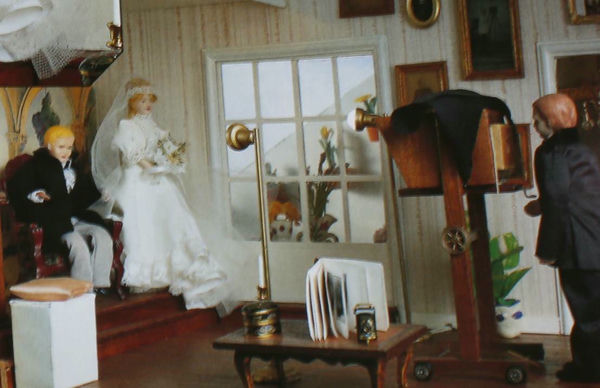 В этом помещении жених и невеста позируют перед фотографом с большой фотокамерой на деревянной стойке. Жених с невестой стоят на подмостках у стены с рисованной декорацией.