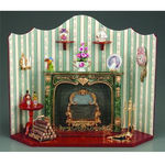 Фрагмент интерьера в масштабе 1:12. Столик и дрова деревянные, камин и элементы декора из фарфора. Ящички стола выдвигаются, глобус крутится. Инструменты для камина металлические. Дрова и инструменты можно отделить от композиции, остальные элементы не отделимы.