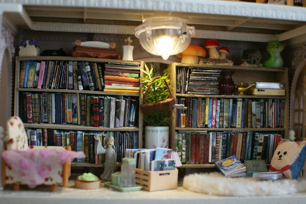 Выше - библиотека (книжки и стеллажи - своими руками):