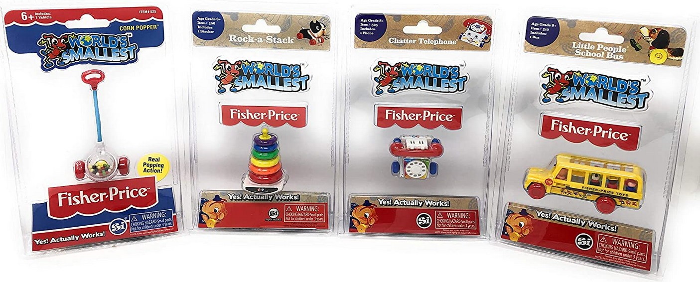 World's Smallest Fisher-Price - это очень, очень крошечные версии знакомых игрушек знаменитого бренда (Corn Popper - Rock-a-Stack - Little People School Bus - Chatter Telephone):