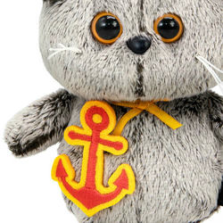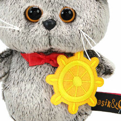 Кот Басик в костюмчике львенка. Костюм выполнен из софта цвета золотистой охры, с пышной гривой капюшоном из меха с длинным ворсом, в котором спрятались маленькие ушки, и грациозным хвостиком с кисточкой. Костюм не снимается, является частью игрушки.