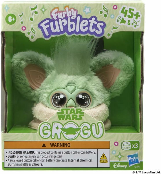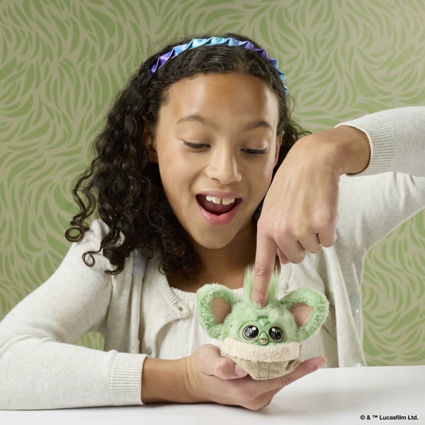 У этой игрушки Ферби Грогу (Furby Furblets Star Wars Grogu) - мягкий зеленый мех, маленький 3-дюймовый размер и более 45 звуковых эффектов.