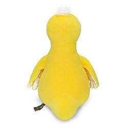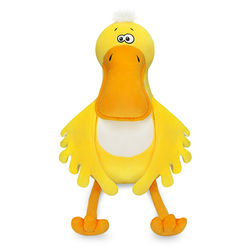 Утка Лу яркого лимонно-желтого цвета, с белоснежной вставкой на грудке. Размашистые крылья составные и сшиты из лимонно-желтого, белоснежного, желтого в горошек софта. Длинные лапки и широкий клюв Лу красивого шафранового цвета. Забавный хохолок на голове утки из длинного меха белого цвета. Любопытные глазки вышиты чёрно-белыми шелковистыми нитками.