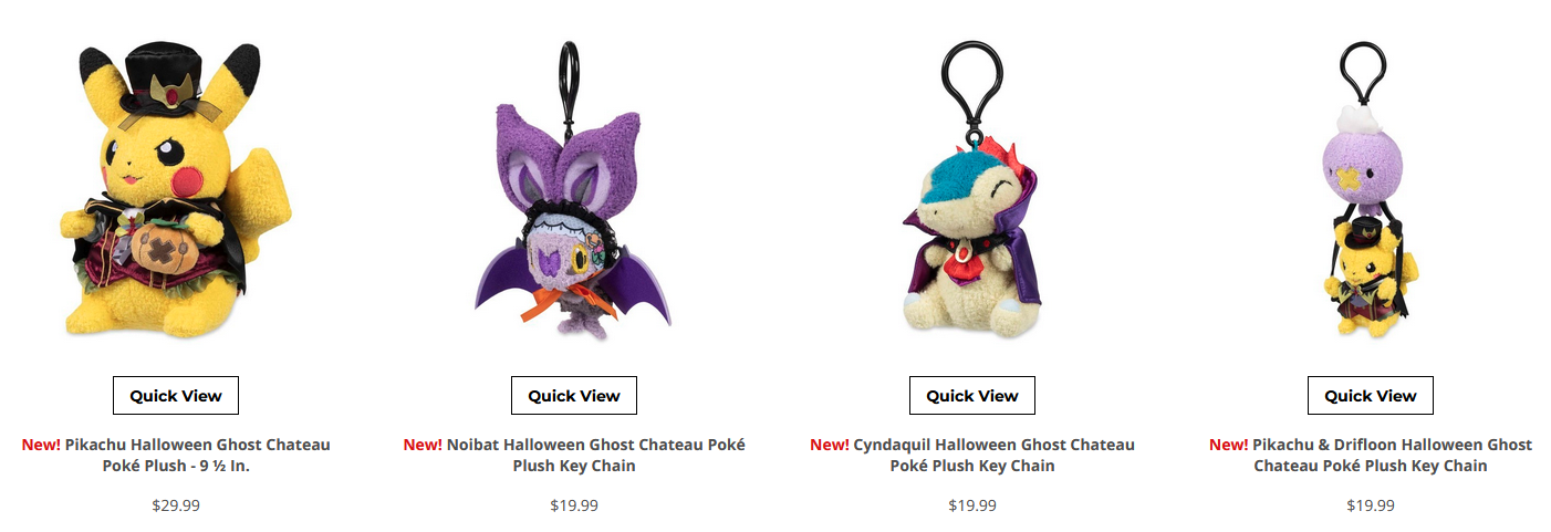 С плюшевыми брелками Halloween Ghost Chateau Poké теперь проще, чем когда-либо, взять с собой в очередное приключение ваших любимых милашек-привидений. Pikachu и Drifloon начинают понемногу проникаться духом Хэллоуина. Teddiursa выглядит по-медвежьи. Пошумите с Noibat, который в этом сенсационном сезоне взлетел ввысь. А Cyndaquil выглядит потрясающе в эффектном плаще.