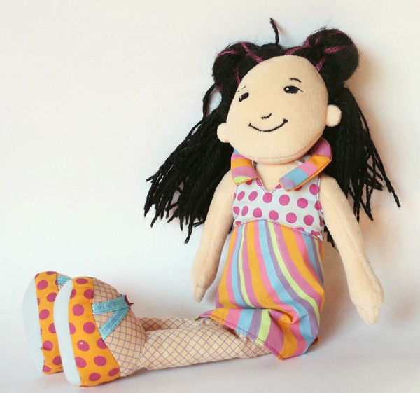 Эта куколка - в сетчатых колготочках (это просто такая расцветка ткани), забавных сандалиях в горошек, лёгком летнем платьице, с чёрными волосами.