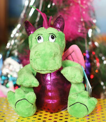 Примечателен дракончик не только гиперфлексом, но и вставками из яркой малиновой блестящей ткани с металлическим эффектом. Из такой ткани у дракончика животик и рожки, а также кончик хвоста. Сам же дракон - плюшевая игрушка, мягкая, зелёного цвета, а его крылья - розовые (плюшевые).