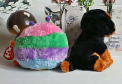 Обе игрушки - небольшие (в сериях представлены разные варианты размеров), это Гусеница Grumdrop Beanie Ball и щенок ротвейлера Beanie Babies по имени Brutus.