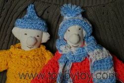 Два кукольных человечка, соседи и друзья, ремонтируют старые механические приборы и пытаются создать новые. А свитера и шапки (и шарф тоже) вязала сестра - по размерам. Подошло просто идеально! :-)