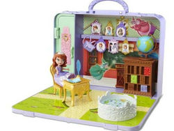 В набор входит мини кукла принцесса София. А также её золотая парта, стул, книга из королевской библиотеки (она открывается), глобус, перьевая ручка, и другие предметы.