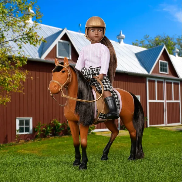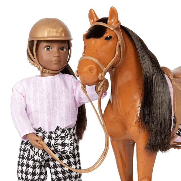 Мини-кукла и лошадка: играйте с Чандой и Корицей! У этой маленькой куклы светло-карие глаза и длинные каштановые волосы, которые легко укладывать. В комплект входит: 6-дюймовая кукла, топ, шорты, шлем, сапоги, 6-дюймовая лошадь, седло, подседельная подушка и уздечка с поводьями.