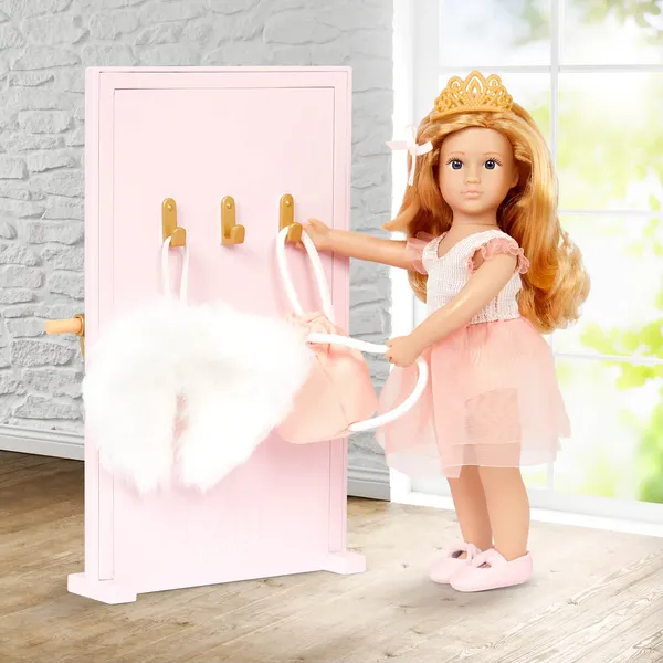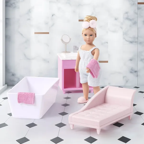 Расслабьтесь в уютной ванне вместе с куклой Аделиной! К этой 6-дюймовой мини-кукле прилагается милый купальный комбинезон, повязка на голову и красивые розовые тапочки. В набор входит ванночка, шезлонг, туалетный столик, зеркало, полотенце и салфетка для лица.