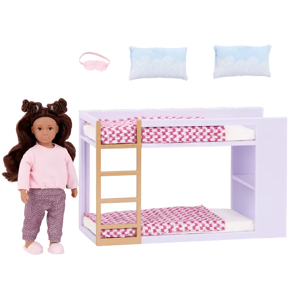 Мини-кукла и комплект двухъярусной кровати. К мини-кукле Тане прилагается симпатичная пижама, красивые розовые тапочки и маска для глаз в тон. В набор входят двухъярусная кровать, 2 матраса, 2 подушки и 2 одеяла.