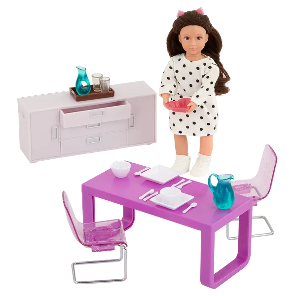 Мини-кукла и набор для столовой: порадуйте себя вместе с Амелией! Эта 6-дюймовая мини-кукла одета в платье в горошек, трусики, носочки, стильную обувь и резинку с бантиком. В набор входят стол, буфет, 2 стула, 2 тарелки, 2 миски, 2 стакана, 2 ножа, 2 вилки, 2 ложки, сервировочное блюдо, графин, кувшин и поднос.