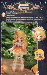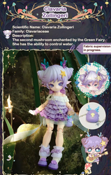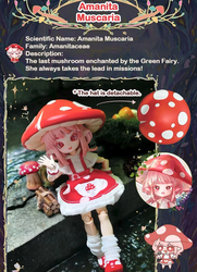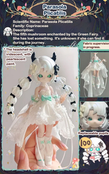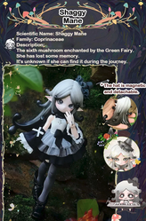 В коллекции 6 обычных кукол и одна секретная. В каждой закрытой коробке находится одна фигурка (кукла в образе гриба определенного вида) и соответствующая идентификационная карточка.
