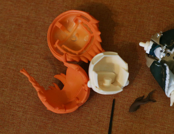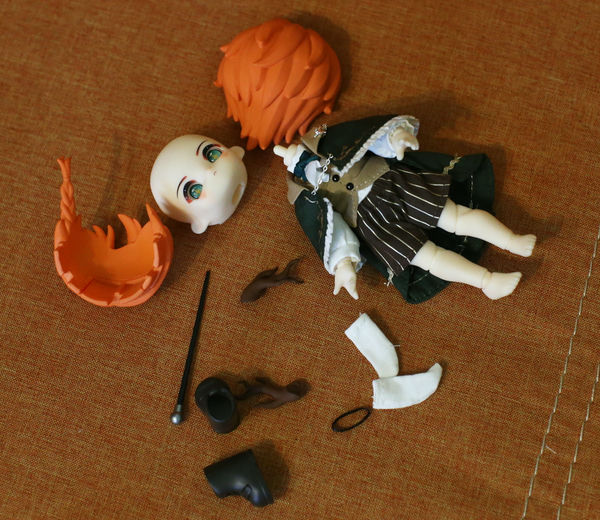 Чтобы одеть накидку, нужно снять голову, так что посмотрим заодно на устройство волос-головы (одна деталь - голова-лицо, две детали - волосы, просто защелкиваются вокруг головы):