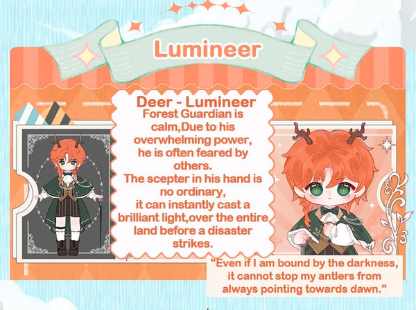 Лесной страж спокоен. Из-за его подавляющей силы его часто боятся другие. Скипетр в его руке весьма необычен: он может мгновенно озарить ярким светом всю землю, прежде чем разразится катастрофа. "Даже если я связан тьмой, это не помешает моим рогам всегда указывать в сторону рассвета".