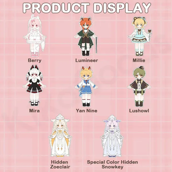 Для коллекционирования доступны 6 обычных фигурок, 1 скрытая и 1 специальная цветная. Соотношение производства обычных мини-фигурок составляет 1/6. Коэффициент производства скрытой мини-фигурки (Zoeclair) составляет 1/72, а коэффициент производства скрытой мини-фигурки специального цвета (Snowkey) - 1/188.