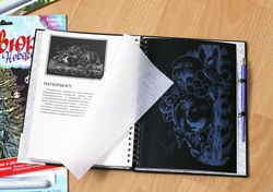 К книге прилагается также небольшой чёрный квадратик, образец, на котором можно потренироваться "сцарапывать" поверхность, попробовать разные штрихи. Используйте тестовый образец, включённый в набор, для обучения проводить толстые и тонкие линии при помощи штихеля.