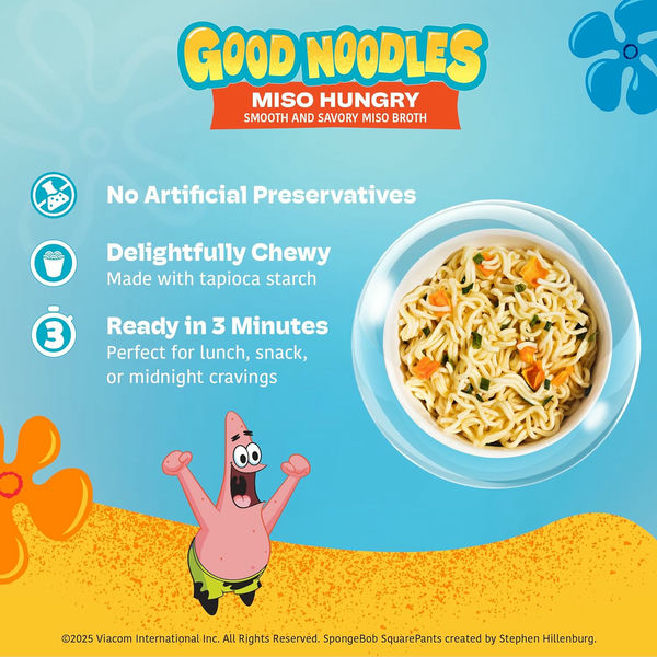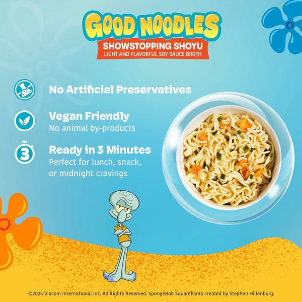 В честь последнего приключения Губки Боба на большом экране - фильма "Губка Боб: в поисках квадратных штанов" - компания A-Sha Foods выпускает три новых чашки для рамена, каждая из которых вдохновлена популярным жителем Бикини Боттом. Каждый продукт полностью веганский и не содержит глутамата натрия, так что вы можете спокойно перекусывать этим раменом столько, сколько хотите. В этих чашках на 25% меньше натрия, чем в обычном рамене, поэтому они определенно заслуживают звания "Лучшая лапша"!
